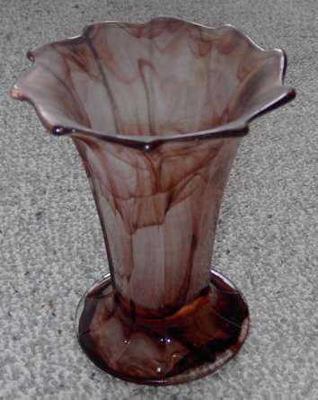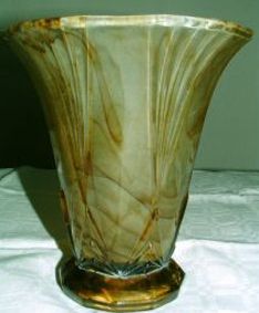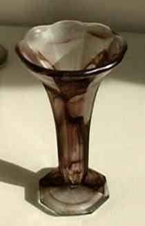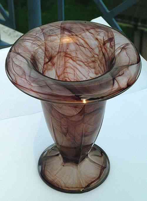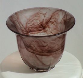 This vase was also sold as the base of a table lamp. The lamp version of the Lotus vase is one of the few known examples of Walther Amber Cloud Glass.