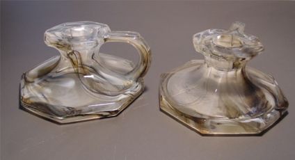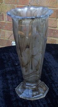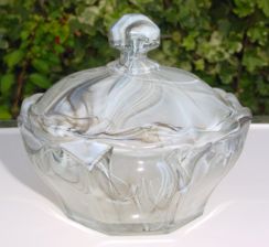Grey Cloud Glass is another very rare colour, with few examples known. Unlike other Cloud Glass colours, the trails in Grey consist of several different colours. The base glass is frosted clear flint glass, which gives it the grey appearance. The trails are predominately a brown colour with a green tinge. In addition trails of a milky white glass and a blue glass have also been added. This gives Grey Cloud pieces a very unusual and distinctive appearance. Grey Cloud Glass was only made by S Reich & Co.