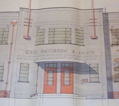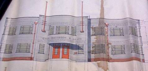Davidson's 1939 Offices - then and now In 1939 plans were approved for some new offices for the Teams Glassworks - despite the fact that money need to be spent on the existing factory (see here). The offices were to be located at the entrance to the site and be built in the Art Deco style. The pictures below show the front elevation of the offices and a close-up view of the entrance.