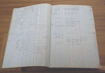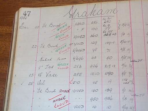 Cloud Glass Web site Since the last newsletter, we have completed the list of Davidson registered designs and the Davidson posy bowl page. The registered designs pages now have the first complete list of all Davidson registered designs. Davidson's Glassmakers Records There are, unfortunately, few surviving records of the Davidson Company. Most if not all of what exists can be found in the Tyne-and-Wear Archives in Newcastle-upon-Tyne. The main bulk of these records consist of 'Account' books for the years 1932 to 1944. These account books are in fact the records of what each of the glassmakers made at the works. From these we were able to create the inventory of Orange Cloud Glass that was first published on this site a few months ago. Each account book covered a period of approximately one year and contained 400 double page entries. Where these records originated is unknown. Their condition shows that they had been in a fire and subsequently water damaged. In fact the Chief Archivist had to unstick some of pages in the volumes before we were able to look at them! They are a mine of information about glass production in the 1930s. The picture below (By permission of the Chief Archivist, Tyne and Wear Archives) shows a typical page from the account books (Sadly the condition of the records is such that they cannot be photocopied).