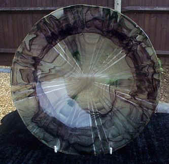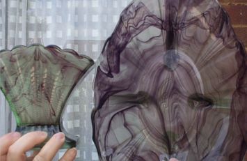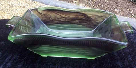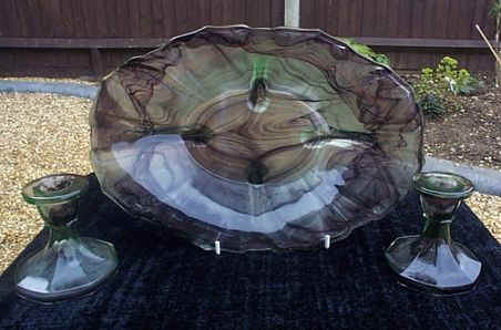 Briar was introduced by Davidson in 1957. This colour, which consists of a green base glass with purple trails, is also known as Topaz by collectors. As well as the standard flower sets and vases, Topaz-Briar can be found in new Davidson shapes such as the Ripple Pattern (above), and the 'Fan Vase' (below), both of which were introduced in 1939. Production probably continued until the early 1960s. Flower bowls are the most common form of Briar found on the market. These come with a matching stand and flower block. The other form of Topaz is Topaz-Violet which was made by August Walther & Sohne in Germany from about 1935. This colour was part of their Oralit range of Cloud Glass and was called 'Malachit'. Unlike Davidson's Briar, Malachit has violet trails on a green glass base. The green base glass in Malachit will fluoresce under a UV lamp. The picture below shows a ripple vase in Topaz-Briar and a 'Pauline' dish in Malachit. Although the picture does not show the different greens, the different trail colours are evident. Some examples of Malachit are shown below. They are in order: 'Perseus' rectangular bowl, 'Pauline' fruit dish and candles and finally a 'Hubertus' bowl.