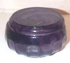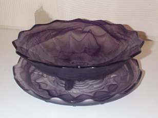 Violet Cloud has violet trails on a clear glass base. Like most Cloud Glass, one surface is usually matt. Most if not all of the Violet Cloud Glass was made by the German Company August Walther & Sohne and sold under the ORALIT label. The powder pot top and vase bottom right appear in the Walther 1934 catalogue. The two piece example at the bottom left of the page consists of a colander bowl resting on a plate. It is very unusual to find any glass colanders. This colander set is from the Walther 'Zentrum' glass suite. As far as we known, Davidson did not make any Violet Cloud Glass.