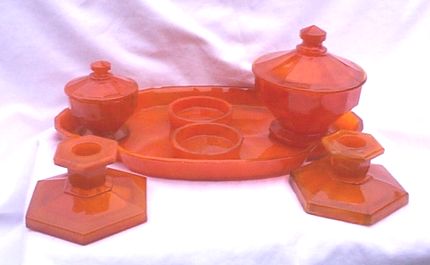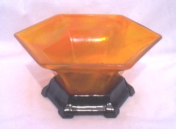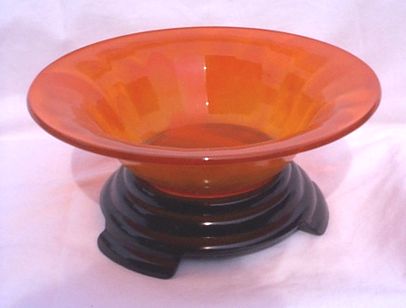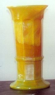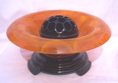 Flower sets in Orange normally have a black stand and flower block. Orange flower blocks and stands were made, but are extremely rare - as can be seen from the table above. The contrast of black on orange was presumably more popular with the buying public. Orange Cloud Glass normally comes with polished upper and lower surfaces. In the 1960s Davidson attempted to revise some of it's earlier designs. A malachite or slag glass was produced which mixed orange, yellow and white. |